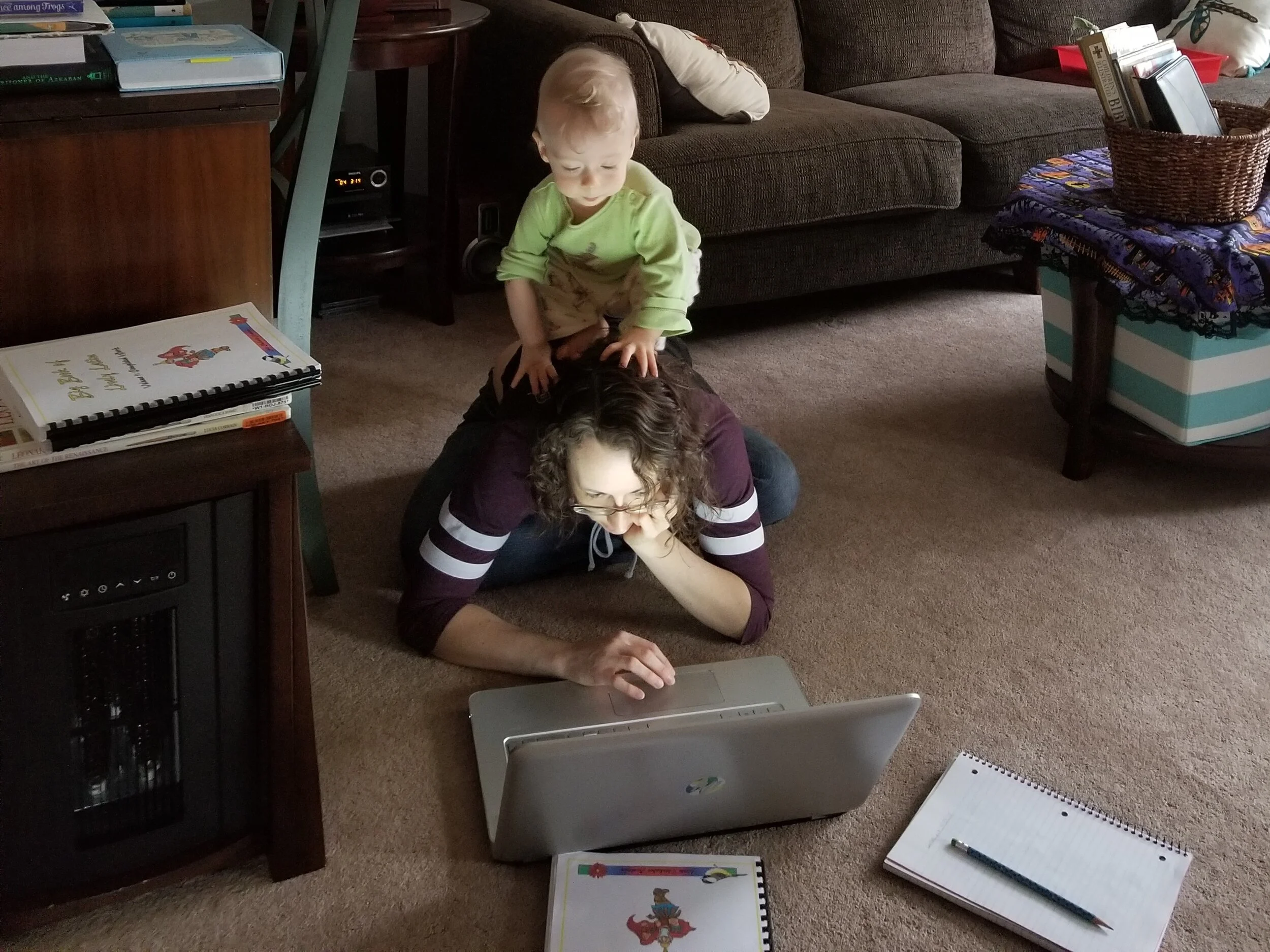 This picture fully captures what it has been like to work on lesson plans, homeschool two children, or try to do…well, ANYTHING, since my youngest child was born. This child, despite being born premature and being incredibly small for his age, was an early crawler and an insatiable climber. He could climb on furniture, and multi-level step stools, before he could walk. If he could walk, he had to run, and if he could climb on stable furniture, why not his mother’s unstable back? If you’re wondering if he went to a standing position after this picture was taken, why yes, yes he did.