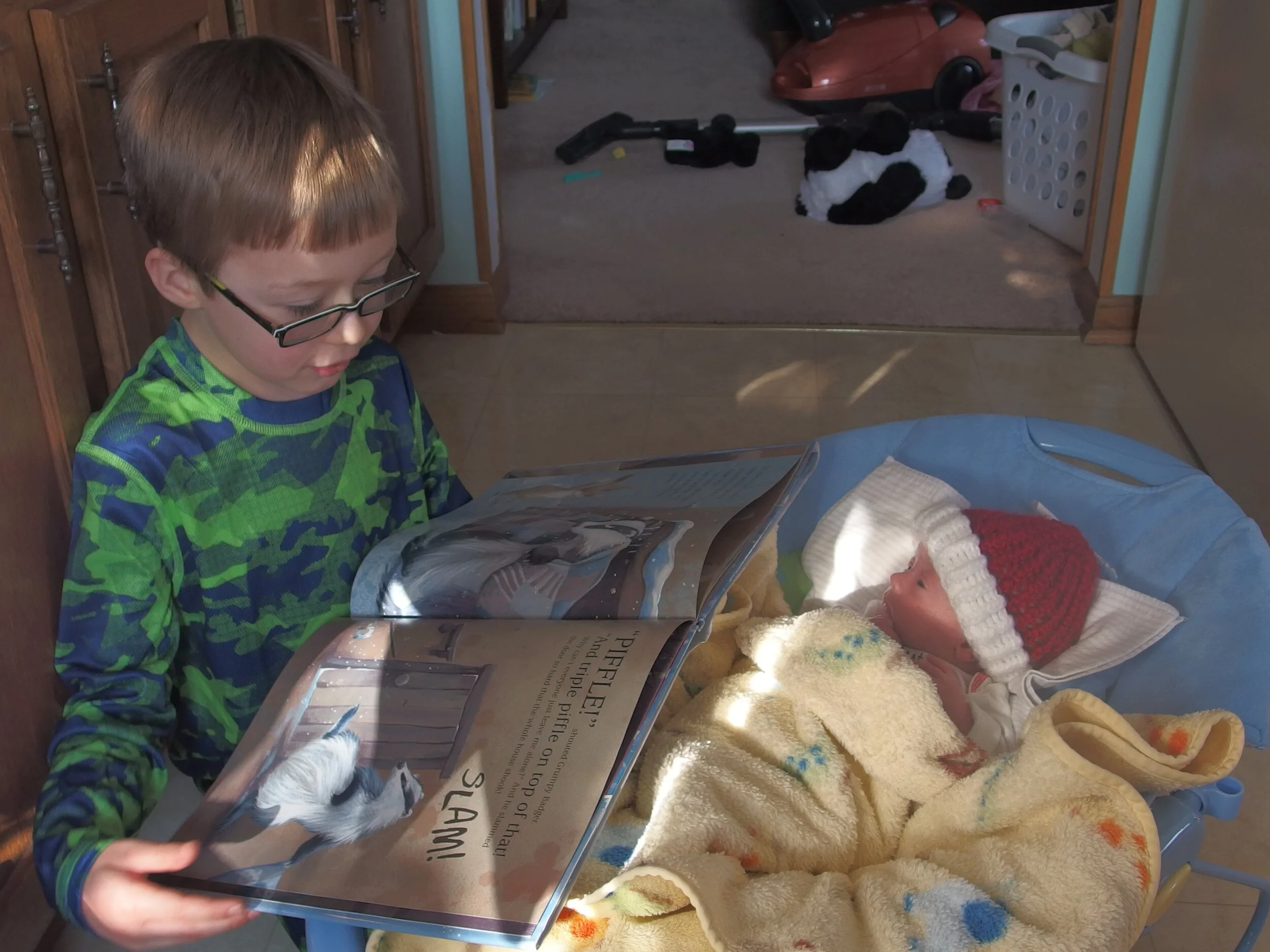 Okay, so after five weeks in the NICU, we brought home our new little guy (who was almost four whole pounds now), and everything went back to normal and our routine was restored! …yeah, not so much. This little guy was feeling very deprived of human snuggles after spending so much time in an isolette, and he was pretty much attached to his mommy all of the time. He wouldn’t stay asleep if he wasn’t being held. Given that I didn’t want him to expend energy for anything other than growth (did I mention he wasn’t even four pounds yet?), I admit I indulged him. He got to sleep on my chest and we learned to adapt our homeschooling routine. It actually went pretty well. The older kids would bring materials to where I was sitting while the baby napped, and we would read and do lessons while I fed him and held him. That worked out pretty well, until he started moving around.